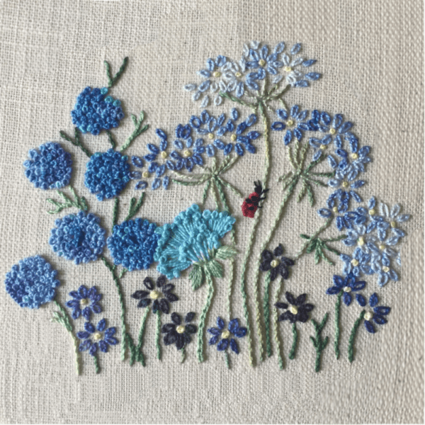 This is a cheerful and beautifully-textured garden design using knotted and daisy stitches. The blue shades used are House of Embroidery hand-dyed Perlé No. 8 threads (a conversion to DMC is included). Embroidered size: 11cm x 13cm (4 1/4″ x 5″)