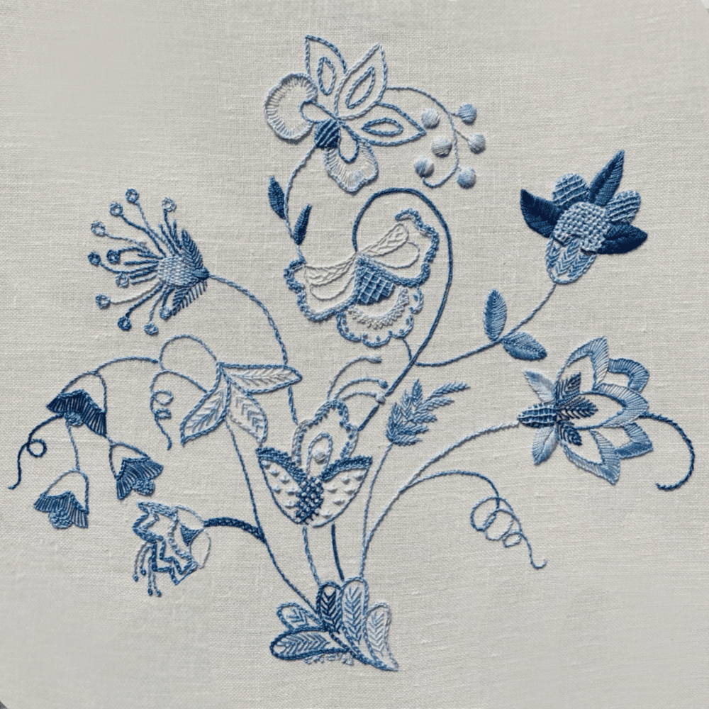 A flowing, stylised design with many interesting stitches using only 6 shades of blue thread, in homage to Delft crockery.