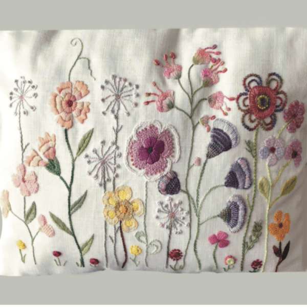 This is one of the large garden series, depicting stylised flowers using exciting, colourful stitches. Using vibrant shades of House of Embroidery Perlé No. 12 threads (a conversion chart for stranded thread is included). Embroidered size: 25cm x 36cm (9 3/4″ x 10 1/2″)