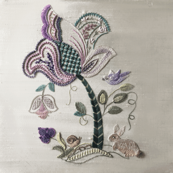 This is a gentle Jacobean style design. incorporating metallic threads, beads and a variety of stitches. Embroidered size: 19cm x 14cm (7 1/2″ x 5 1/2″)